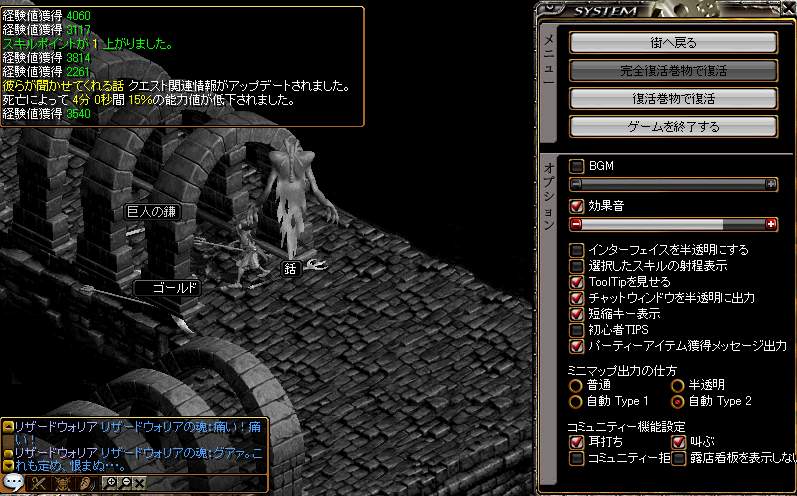 ただし、死亡しても「街に戻る」でダメルへ帰還してOkですが、デスペナルティは発生します。