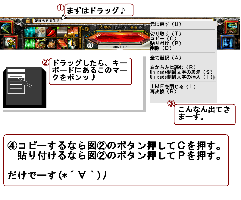 skypチャット・Blog・mixi・ツイッター等のRS以外でのRS画像を載せたい…でも自分のキャラ名や相手のキャラ名もばれちゃう。。。という場合に、最も簡単に出来る編集方法です。