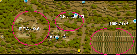 ②3つ目のフィールド(東プラトン街道/エルベルク山脈 峠)の右上端に、鉱山町ハノブの入口があります。