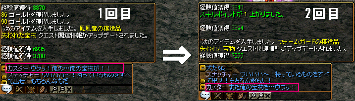 | 注意事項 | ☆クエストクリア直後のカトナとの会話選択で、報酬が変化します。 カトナとの会話の最後で1)を選んだ場合は10万の経験値追加、2)を選んだ場合 は10万Goldが報酬として入ります。 ☆雑魚として湧いているスナッチャーの数が多い&カスターの回避は 鬼です。 スナッチャーは、カスターの所に行くだけでも10体近く。 さらに、対象MOBであるカスターは異常な回避率で、Lv150代でも半分当た れば良い方。ドロップも悪いので、平均30分は狩り続けることになります。 回復アイテムはかなり余裕を持ちましょう。 |