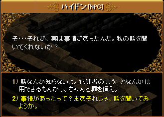 | クエスト詳細 | 逮捕しなければならない人物の名前はハイドンだが、正確な情報把握のためには 荒廃都市ダメルの人々に会い、操作をしなければならない。 |