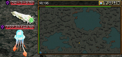 カリン・デイスに2つの宝石を渡すと、今度はハンヒ山脈/ドレム川付近・河口ダンジョン“ミ”へ。ここで狩るのは アクアスライム と クローラー の2種類。