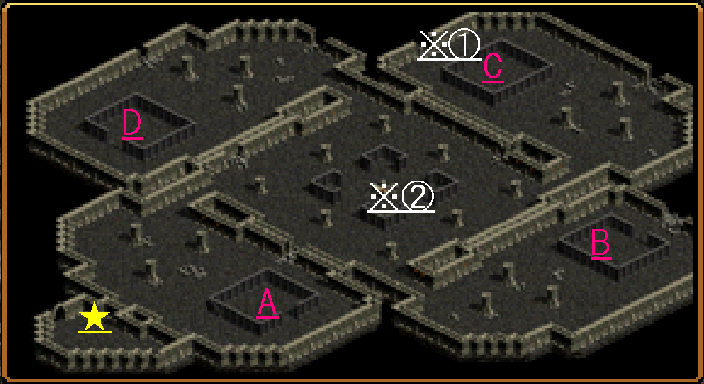 リーダーが ★1 (NPCピーターソン)に話しかけてスタート。 リーダーがNPCに話しかけ終わると、NPC右手側が開門可能に。 |