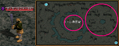 入ってすぐの分かれ道を左上に進み、川に沿って上った先の橋を渡った右突き当り付近にオーガの巣窟入口があります。