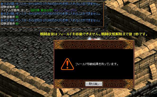 こんな感じで、フィールド移動しようとすると戦闘後10秒移動不可ルールの黄色い文字が出ちゃって、マップが切り替わらなくなる事たまにありますよね。