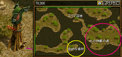 ゴリマ沼地に着いたら←に進み、橋を渡って大きく反時計回りにマップ左下を目指すと到着。変なトーテムポールっぽぃ柱に触ると、水の神獣の島に上陸します。