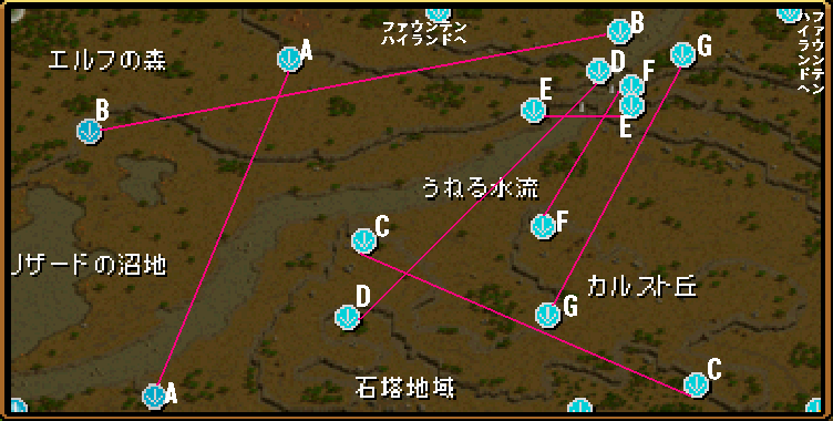 スマグ右側出口を出て、次のフィールドを洞窟を抜けながら↑出口に。タトバ山を→に抜けたらドレム川付近になります。河口ダンジョン“ド”~“ミ”は右側に下っていく道を。“ラ”は左側に下っていく道を通る事になります。
