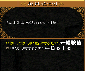 | 注意事項 | ☆クエストクリア直後のカトナとの会話選択で、報酬が変化します。 カトナとの会話の最後で1)を選んだ場合は10万の経験値追加、2)を選んだ場合 は10万Goldが報酬として入ります。 ☆雑魚として湧いているスナッチャーの数が多い&カスターの回避は 鬼です。 スナッチャーは、カスターの所に行くだけでも10体近く。 さらに、対象MOBであるカスターは異常な回避率で、Lv150代でも半分当た れば良い方。ドロップも悪いので、平均30分は狩り続けることになります。 回復アイテムはかなり余裕を持ちましょう。 |