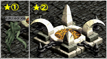 | Ⅰ | ★ ①(デスビジョン)に話しかけて、ダンジョンクエスト開始。入口が開放される。 |