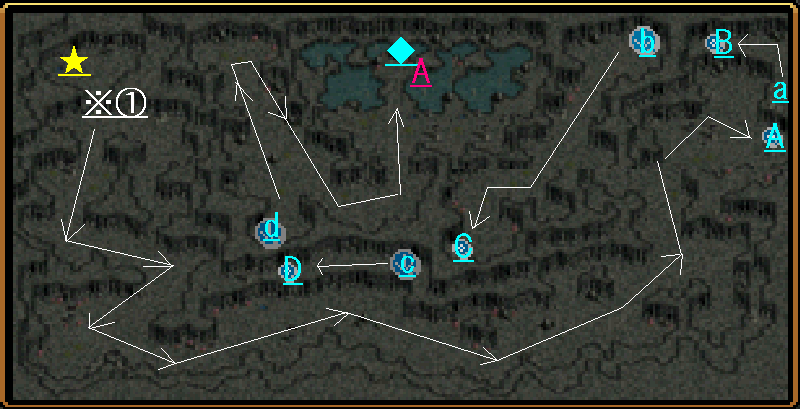 A~D⇒次のエリアに飛ぶためのワープ装置 a~d⇒大文字A~Dのワープ装置に触れた際の、ワープ先。 |