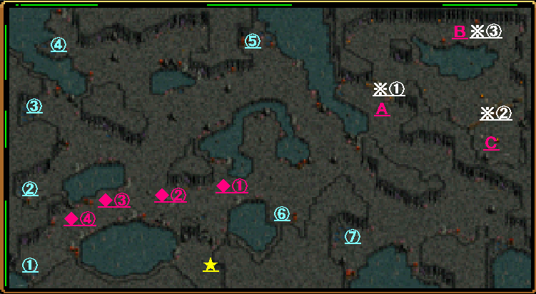 | Ⅲ | 11体全て倒し終わったら、再度湧いた雑魚MOB達(主に⑫へ行く道沿い&⑥の箇所に居ます) を倒しながら ⑫ を目指す。 ただし、※① に有るトラップは、HPが低いと即死する可能性も有る強い罠です。 踏まないように注意・または硬い人に踏んでもらいましょう。 |